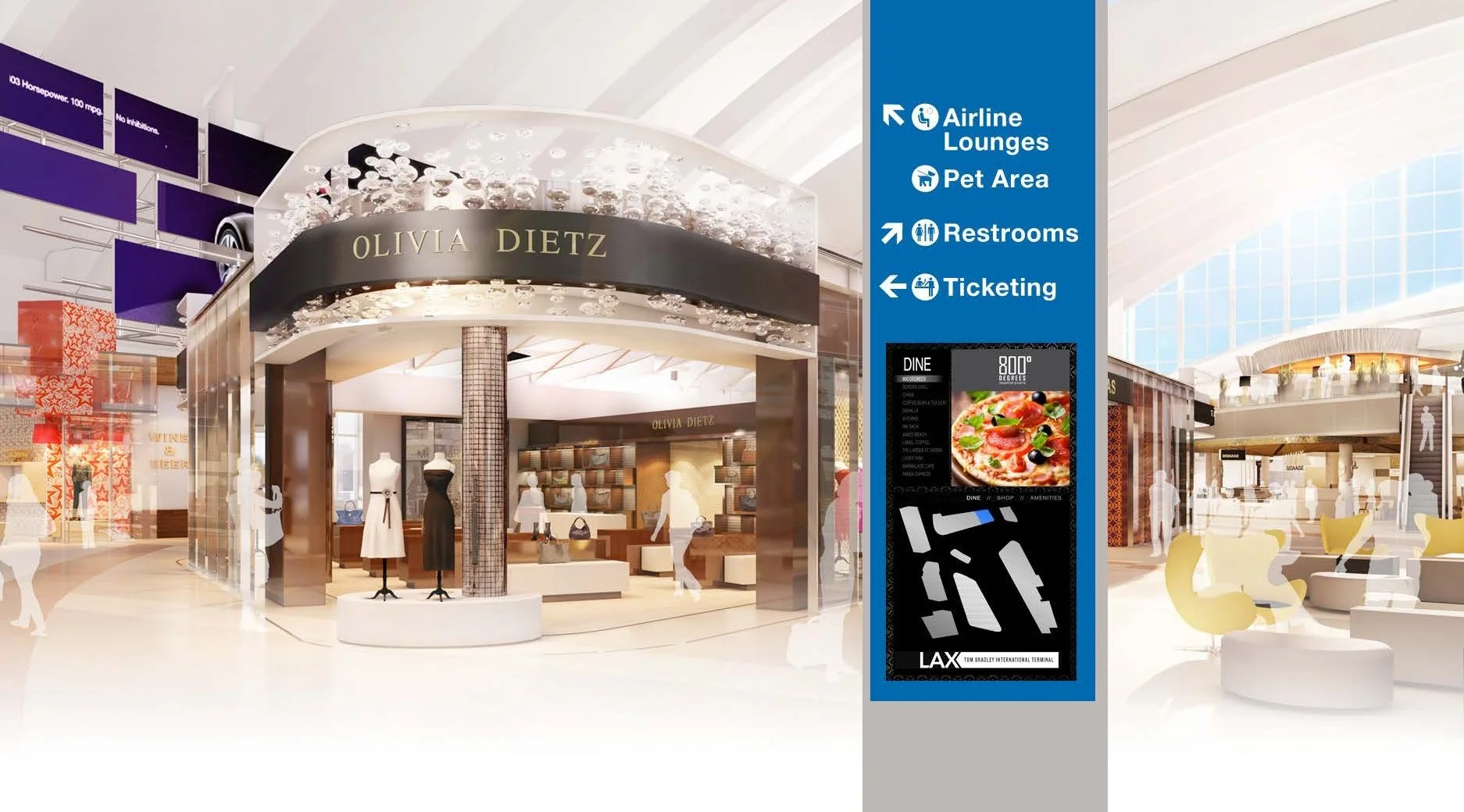 This freestanding unit was designed to help travelers navigate the retail and dining options inside the terminal.